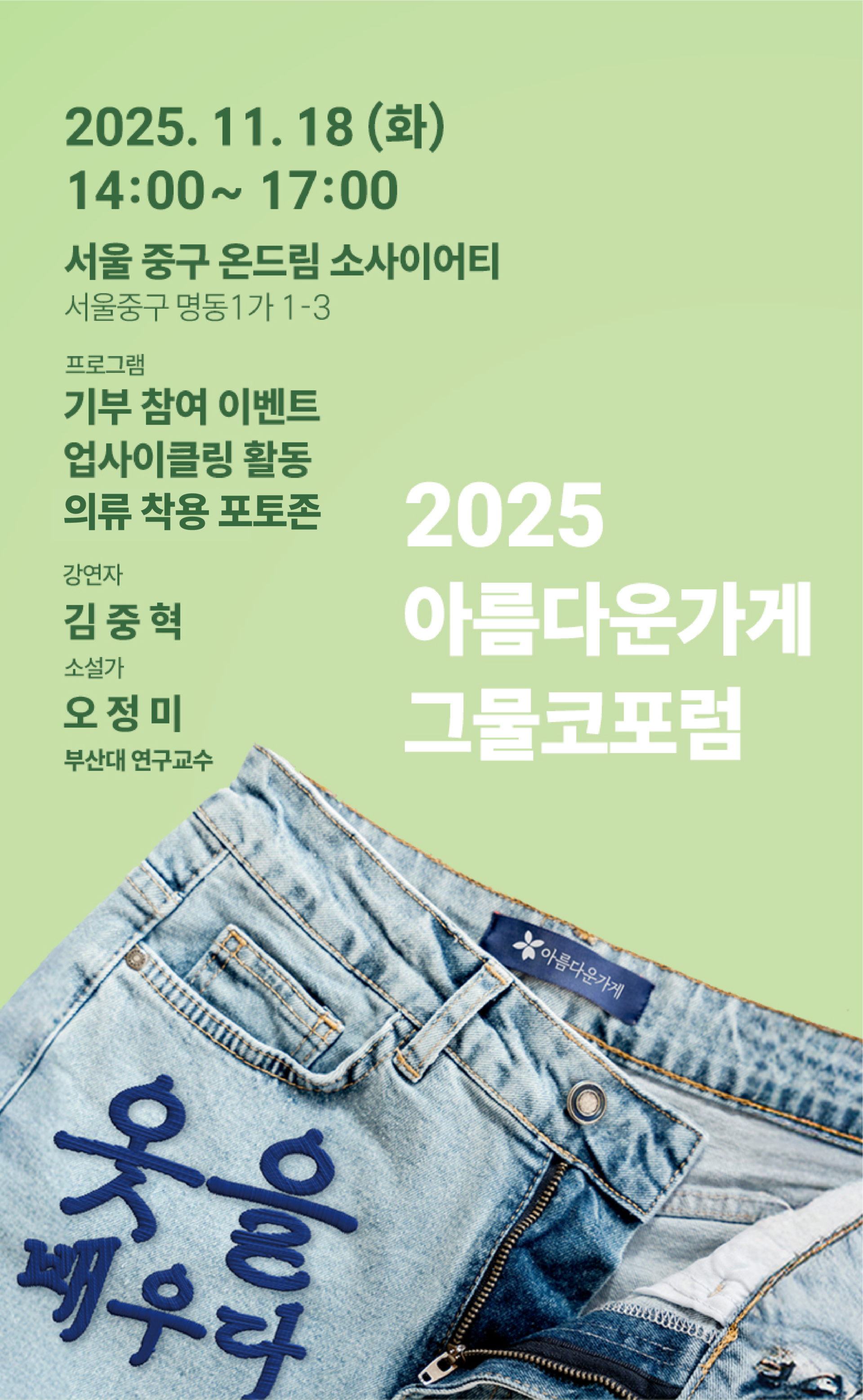 - 입장 안내: 물품 기부 및 이벤트 참여는 13시부터 입장 가능하며, 강연은 14시부터 시작됩니다 (강연 5분 전 착석을 부탁드립니다)